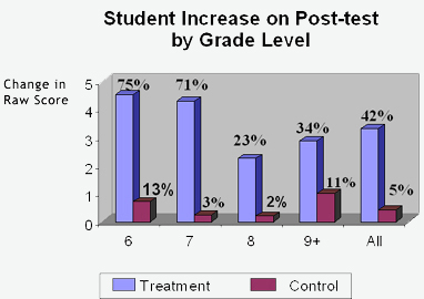 Help Math showed gains of more than 70% for 6th & 7th graders on standards-aligned tests Click here for complete HELP Evaluation White Paper. Phase 2: Full Study The HELP Math program was awarded a large multi-year U.S. Department of Education grant to further research and develop the program. Research independently conducted by the University of Colorado used an experimental model involving approximately 1,000 students across six states: Texas, California, New York, Oregon, Illinois, and Colorado. The research showed significant increases in ELL student achievement. Students targeted by HELP at language level 1 (least proficient in English) and level 2 (limited English proficient) demonstrated higher math scores on standards-aligned pre-post tests using HELP than students in the comparison group. AYP math scores for ELLs rose in all participating research schools on average by 18%. Student achievement on the end-of-modules quizzes is high (in some cases in excess of 300%) and teacher feedback on the program and training (from surveys and focus groups) is extremely positive, confirming the findings of the initial research.